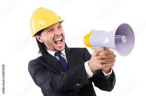 Man with helmet and loudspeaker on white