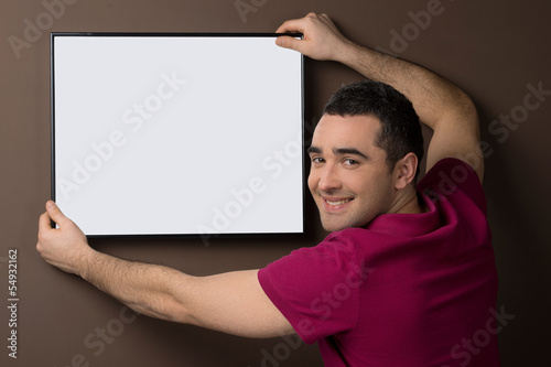 30s, 40s, adult, candid, enjoyment, facial expression, photogenic, hanging, happiness, holding, lifestyle, man, one man only, poster, showing, standing, toothy smile, white, young adult