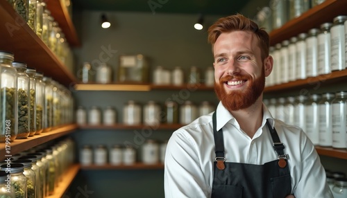 Man with red beard smiles in cannabis shop. He works near shelves with glass jars. Store offers medical marijuana products. He is happy employee.
