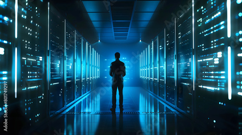 Man working on laptop in server room