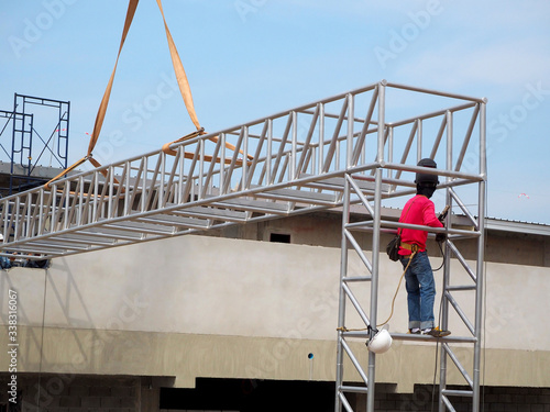 height, working, work, construction, safety, harness, men at work, sky, blue, man, height, scaffold, helmet, hard hat, site, scaffolding, person, white, industry, ambient, background, men at work, compensation, building, equipment, climbing, job, high, engineering, male, project, platform, risk, design, light, 1, technology, frame, metal, city, construction site, construction worker