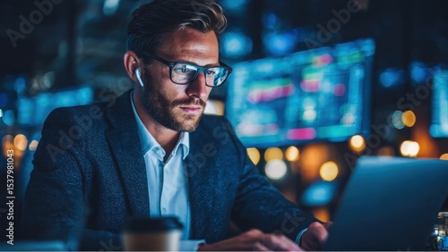 man, laptop, office, night, goggles, earbud, professional, working, datum, finance, businessman, work, computer, technology, monitor, desk, workspace, late, entrepreneur, business, modern, screen, light, executive, confident, serious, suit, shirt, indoor, male, young, adult, job, employee, occupation, trade, analysing, stock, stock exchange, stock exchange, people, cyberspace, communication, woman, person, digital, network, web, concept