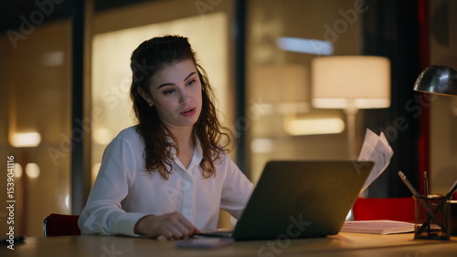 businesswoman, video, call, night, workplace, closeup, late, manager, consulting, talking, evening, woman, laptop, office, business, document, professional, employee, online, conference, discussing, paper, confident, sitting, holding, virtual, meeting, computer, successful, freelance, overtime, happy, communication, female, men at work, technology, work, cyberspace, young, modern, dark, desk, indoor, project, company, entrepreneur, corporate, slow motion