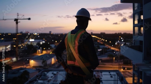 Manager silhouette interacting with maintenance schedules, active property site, dusk, aerial view, photorealistic