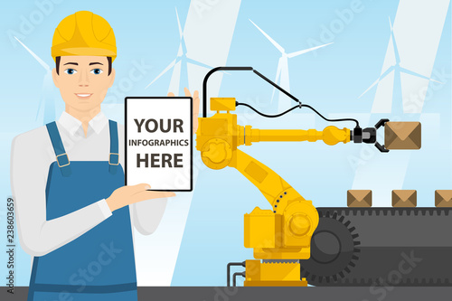 Manager with a digital tablet controls the handling robot. White screen, you can add your infographic here.