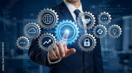 Manager,interacting,with,mechanical,gears,and,digital,business,icons,concept,of,workflow,optimization,system,integration,operational,efficiency,and,strategic,organizational,alignment.