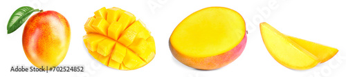 Mango fruits cut in different ways and one whole isolated on white