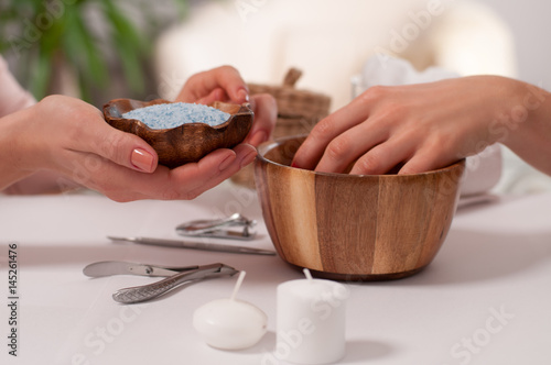 Manicure concept. Beautiful woman's hand nails in the spa.