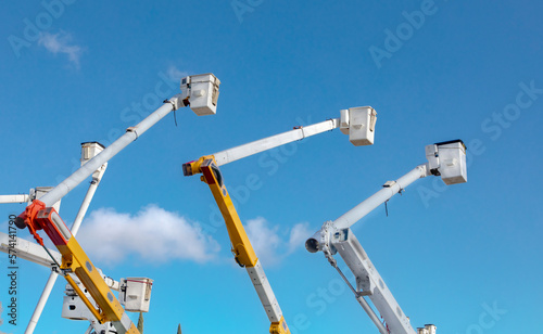 Manlift boom arms for utility work or trtee trimming against a blue sky