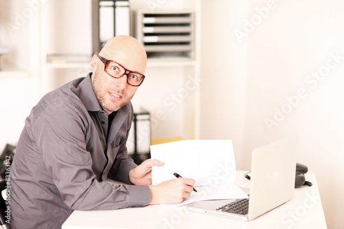 man, count, money, tariff, saving, business, businessman, communication, computer, man, mobile phone, office, people, sitting, shirt, grey, online, bill, notebook computer, computer, cyberspace, spectacle, bald, thrifty, award, cost