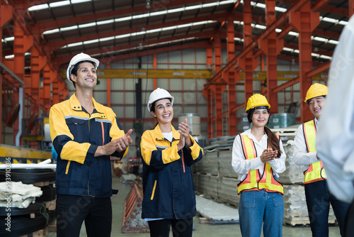Manufacturing industrial factory concept. Group of male and female factory workers working, meeting and discuss at manufacturing production lines in factory during manufacturing process