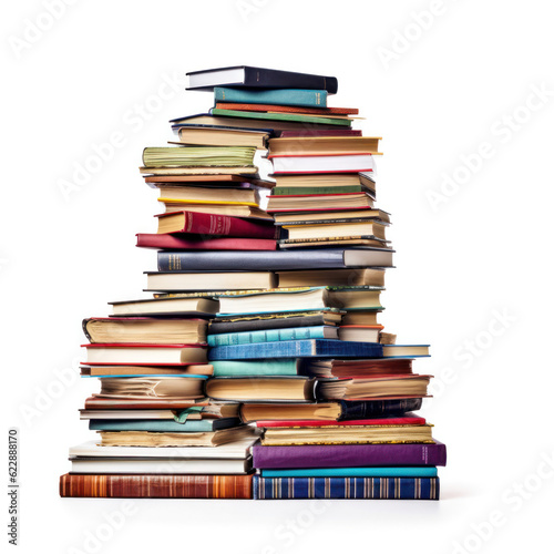 Many books with bright covers in one stack on a white background. Place for text. Design element, paper and leather texture. Colorful books closeup. education and learning concept.Generative AI