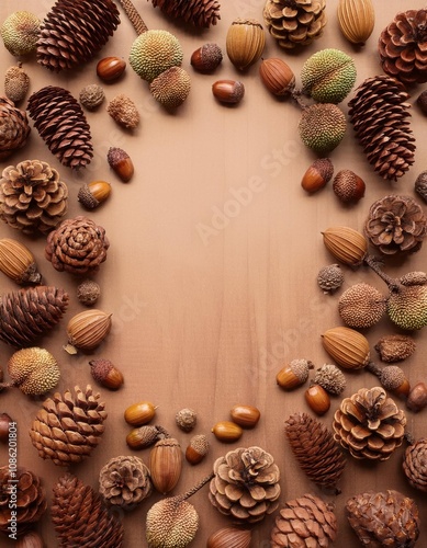 nut, pine cone, acorn, walnut, hazelnut, chestnut, almond, pecan, pistachio, cashew, peanut, pine nut, coconut, autumn, fall, harvest, seasonal, frame, circle, arrangement, natural, organic, texture, diversity