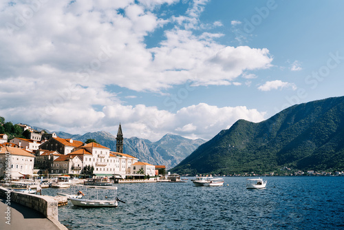 Many excursion boats with canopies are moored off the coast of Perast with views of the mountains. Montenegro