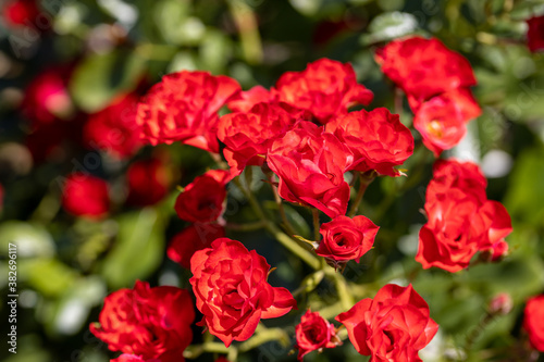 Many flowers of a red twisting rose. Detailed macro view. Flower on a natural background, soft light.