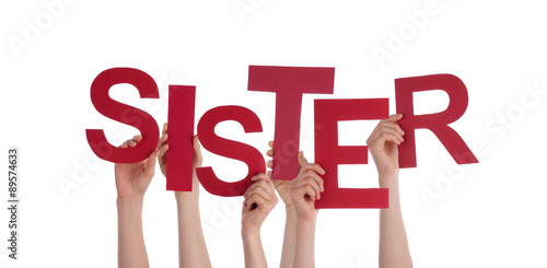 Many People Hands Holding Red Word Sister