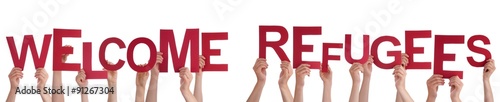 Many People Hands Holding Word Welcome Refugees
