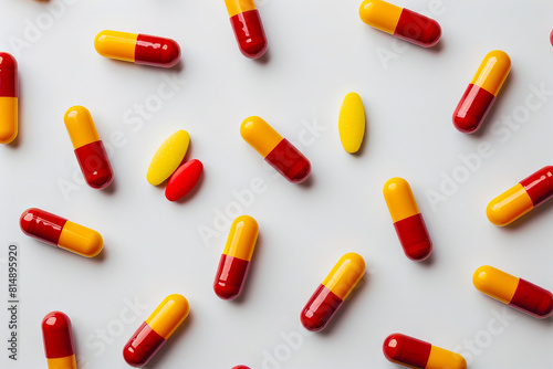 Many red and yellow pills on a white background.
