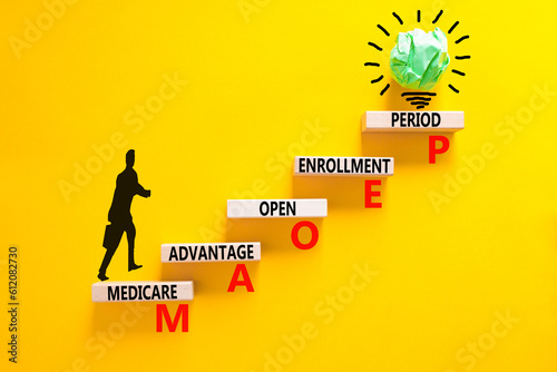 MAOEP symbol. Concept words MAOEP medicare advantage open enrollment period on wooden block. Beautiful yellow background. Medical MAOEP medicare advantage open enrollment period concept. Copy space.