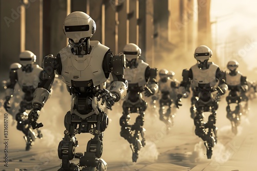 Marching Robot Army Advancing in Dystopian Future Landscape