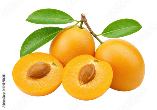 marian, plum, fruit, yellow, leaf, tree branch, ripe, tropical, sweet, food, healthy, nature, fresh, juicy, closeup, half, seed, delicious, exotic, vibrant, image, whole, halved, complete, with, leaf, visible, attracted