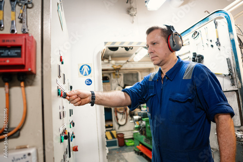 Marine engineer officer controlling vessel enginesand propulsion in engine control room ECR. Ship onboard maintenance