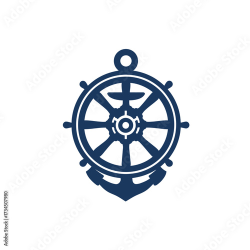 Marine symbol dark blue steering wheel with an anchor on a white isolated background