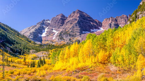 mountain, landscape, mountain, nature, sky, autumn, forest, fall, tree, blue, vale, park, green, snow, tree, yellow, rock, view, colours, national, travel, aspen, peak, alpine, meadow