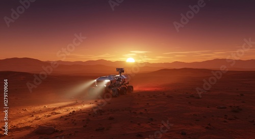mars, rover, exploration, space, sunset, planet, science, astronomy, mission, research, vehicle, surface, solar, martian, discovery, technology, future, alien, cosmos, probe, robot, equipment, innovation, landscape, horizon, machine, investigate, dusty, mountain, red, adventure, journey, datum, universe, engineering, artificial, intelligence, communication, unmanned, remote, monitor, transportation, dust, travel, laboratory, desert, canvasses, rocky, light