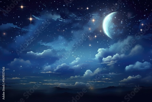Marvelously Beautiful Blue Night Sky with Clouds, Full Moon and Stars