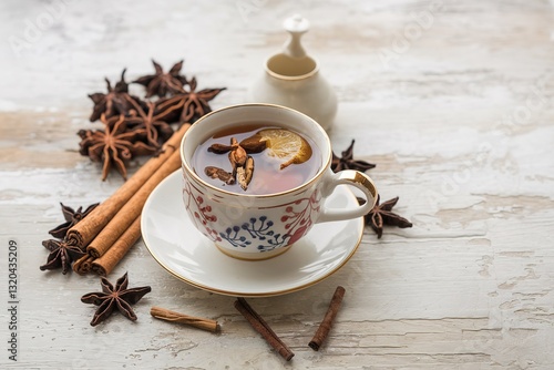 Masala tea in ceramic cup with winter spices