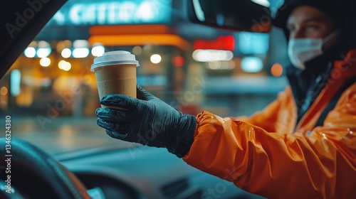 hot drink, driver, masked, night, city, delivery, hand, glove, car, cup, transportation, food, drink, urban, street, traffic, vehicle, person, men at work, service, safety, protection, health, business, job, professional, uniform, orange, dark, light, road, travel, cafes, eatery, evening, disposable, hot, take-out