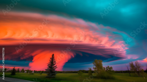 Massive colorful tornado with orange, pink, and teal swirling clouds