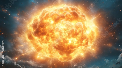 explosion, fire, space, cosmic, fiery, massive, spectacle, blast, inferno, supernova, incandescent, combustion, detonation, flare, burst, eruption, ignition, heat, energy, power, light, bright, intense, brilliant, dazzling, aglow, radiant, glowing, orange, yellow, gold, smoke, debris, particle, dust, gas, celestial, astronomic, universe, galaxy, star, nebula