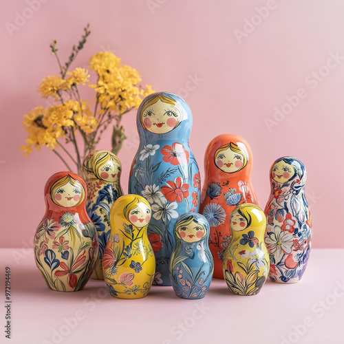 Matryoshka dolls in vibrant colors with intricate floral designs isolated on a pastel pink background