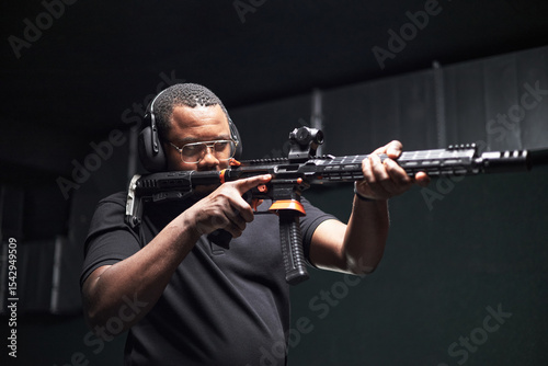 sport, shoot, male, black man, african american, client, club, firearm, rifle, aim, training, marksmanship, sharpened, concentration, precision, hobby, activity, weapon, competition, practice, recreation, skill, range, accuracy, serious, portrait, self protection, tactical, sportsman, lifestyle