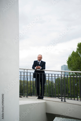 outdoors, daytime, urban, business, check, caucasian, professional, colours, man, bridge, structure, over, hold, cloudy, communication, human, alone, traditional, metal, individual, racked, image, front, european, city, businessman, suit, railing, rail, businessperson, executive, necktie, serious, mobile phone, phone, attaching, standing, mature, person, paseo, frontal, grave, overcast, cement, picture, german, message, 1, photograph