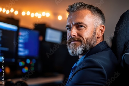 mature, caucasian, male, office, computer, professional, business, beard, work, technology, light, smile, businessperson, chair, desk, suit, screen, evening, relaxed, workplace, sharpened, concentration, career, industry, executive, indoor, attitude, determination, corporate, success, occupation, job, modern, seating, ambient, illuminated, profile, charisma, confident, appearance, productivity, digital, stylish, atmosphere