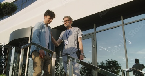 Mature doctor with tablet in hands stands with patient at clinic entrance, discuss treatment. Healthcare specialist says goodbye to client after appointment, then looks at camera. Medic works outside.