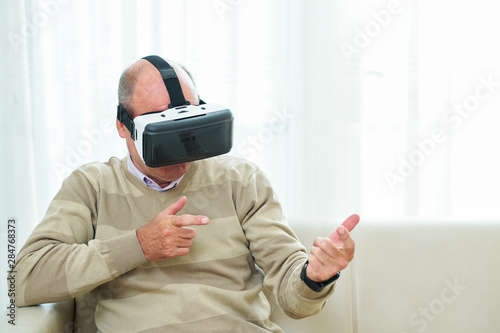 Mature man in virtual reality headset shooting with gun in videogame at home