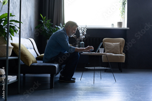 Mature man shopping online on laptop, using credit card at home.