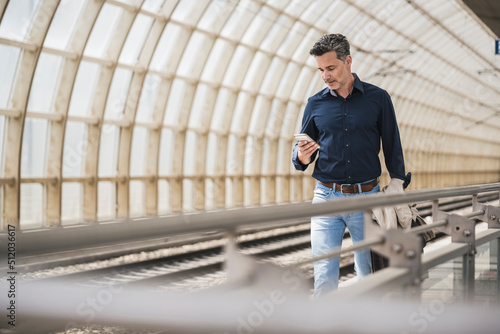 mature, man, using, phone, walking, railroad, station, technology, smartphone, copy space, 1, people, travel, communication, adult, online, business, day, german, mobile, wireless, connection, train, cyberspace, texting, public, transport, businessman, remote, working, trip, mobility, looking, holding, shirt, caucasian, lifestyle, journey, male