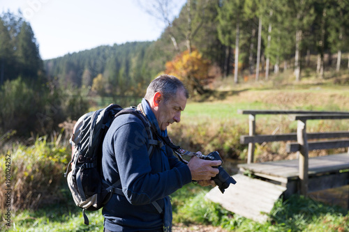 Mature man with backpack looking at pictures on camera in forest