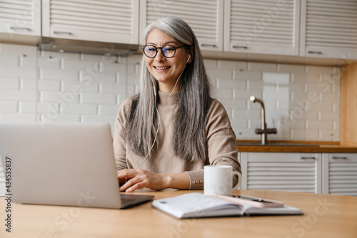 woman, adult, mature, asian, home, kitchen, to sit, computer, laptop, planner, hot drink, cup, earphones, music, listen, mobile phone, table, work, grey, smile, eyeglass, indoor, day, 1, people