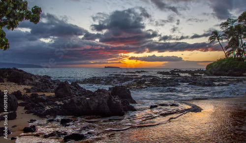 beach, maui, hawaii, ocean, water, beach, palm tree, rock, sky, cloud, cloud, island, wave, wave, surf, sand, landscape, landscape, view, view, sunset, sun, evening