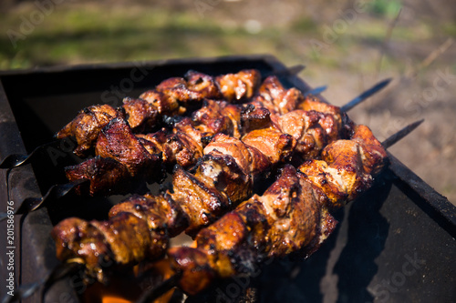 Meat with spicy sauce on skewers fried on an open fire