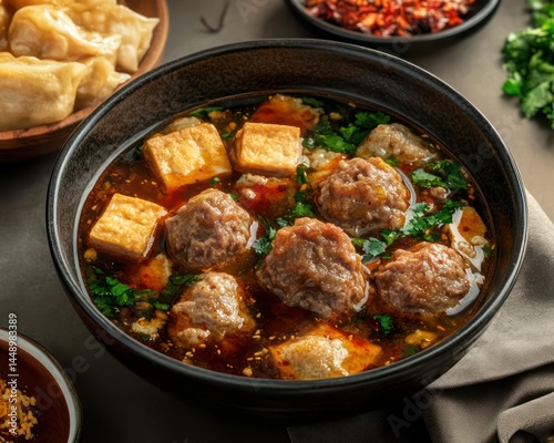 soup, meatball, tofu, food, dish, bowl, brown, vegetable, meat, meal, cooking, asian, eatery, hot, healthy, delicious, tasty, closeup, closeup, isolated, food photography, cookery, plate, dinner, lunch, serving, ingredient, dinnerware, kitchen, contemporary, traditional, colourful, comfort food, copy space, horizontal, still life, image