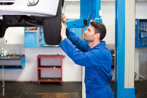 young adult, man, male, caucasian, mechanic, auto mechanic, car, workshop, manual, men at work, machinist, service, occupation, garage, coverall, expertise, blue, automobile, checking, tire, wheel, fixing, repairing, indoor