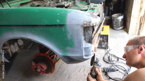 Mechanic polishing auto with electric equipment at workshop. Skillful mechanic restoring automobile. Repairman grinding old car body using grinder machine. Man engaged servicing car in garage. Slow mo