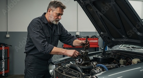 mechanic, working, car, engine, workshop, automotive, repair, tool, focused, male, adult, hand, vintage, vehicle, garage, service, skilled, maintenance, closeup, occupation, labor, old car, professional, hardware, craftsmanship, dedication, technician, machinery, auto, greasy, industrial, worked, restoration, manual, grey, serious, task, concentration, expertise, project, precision, man